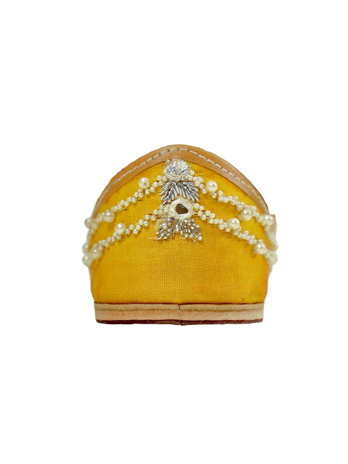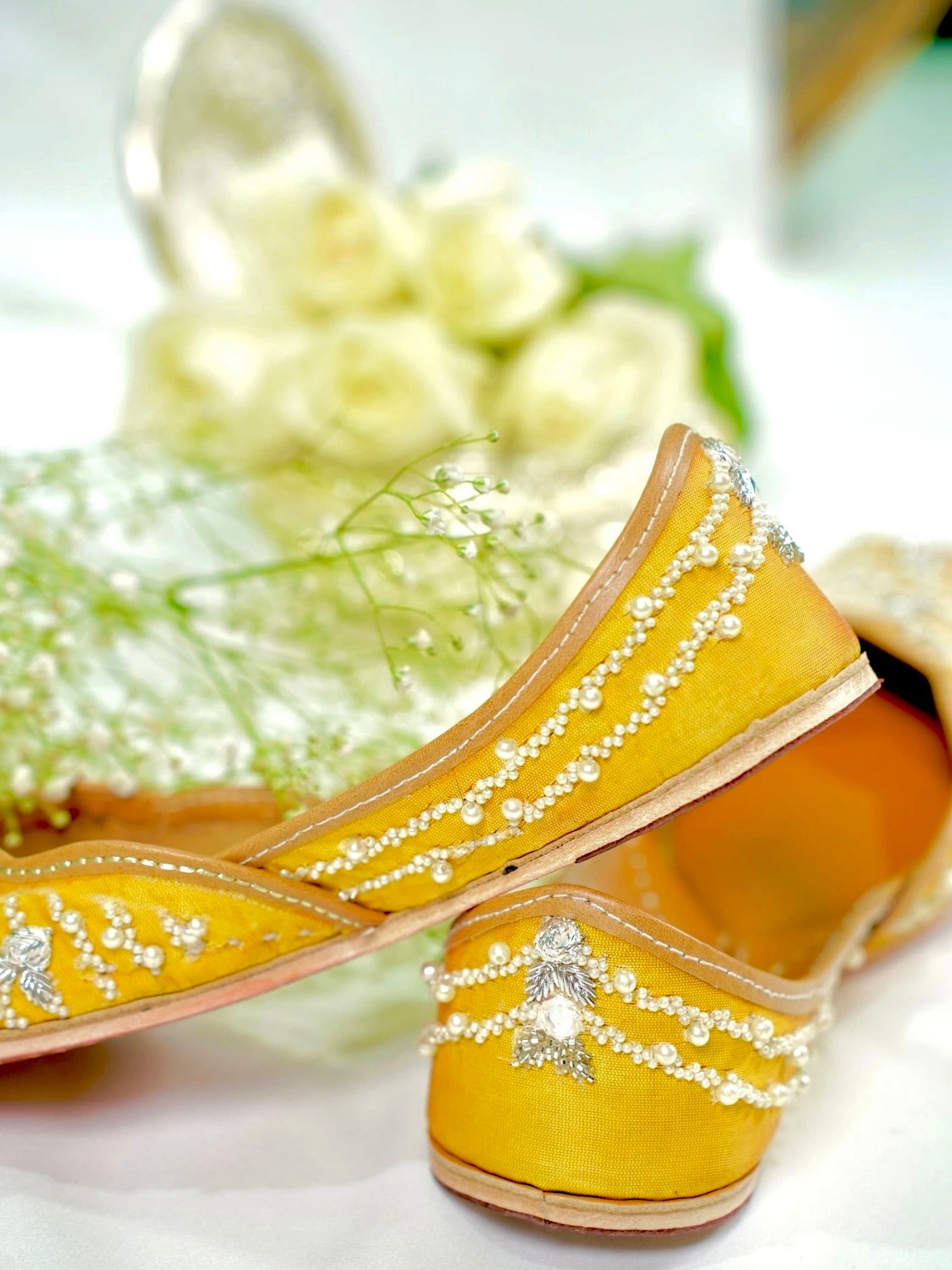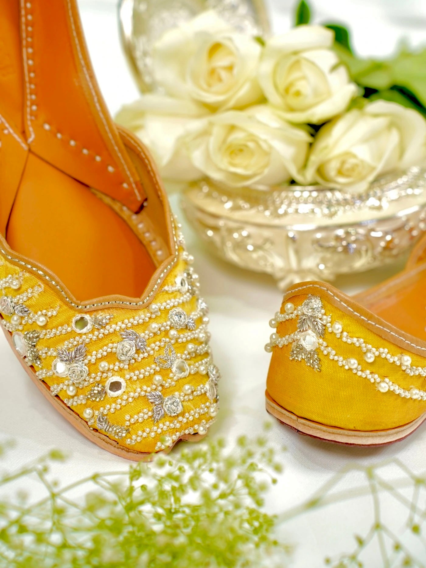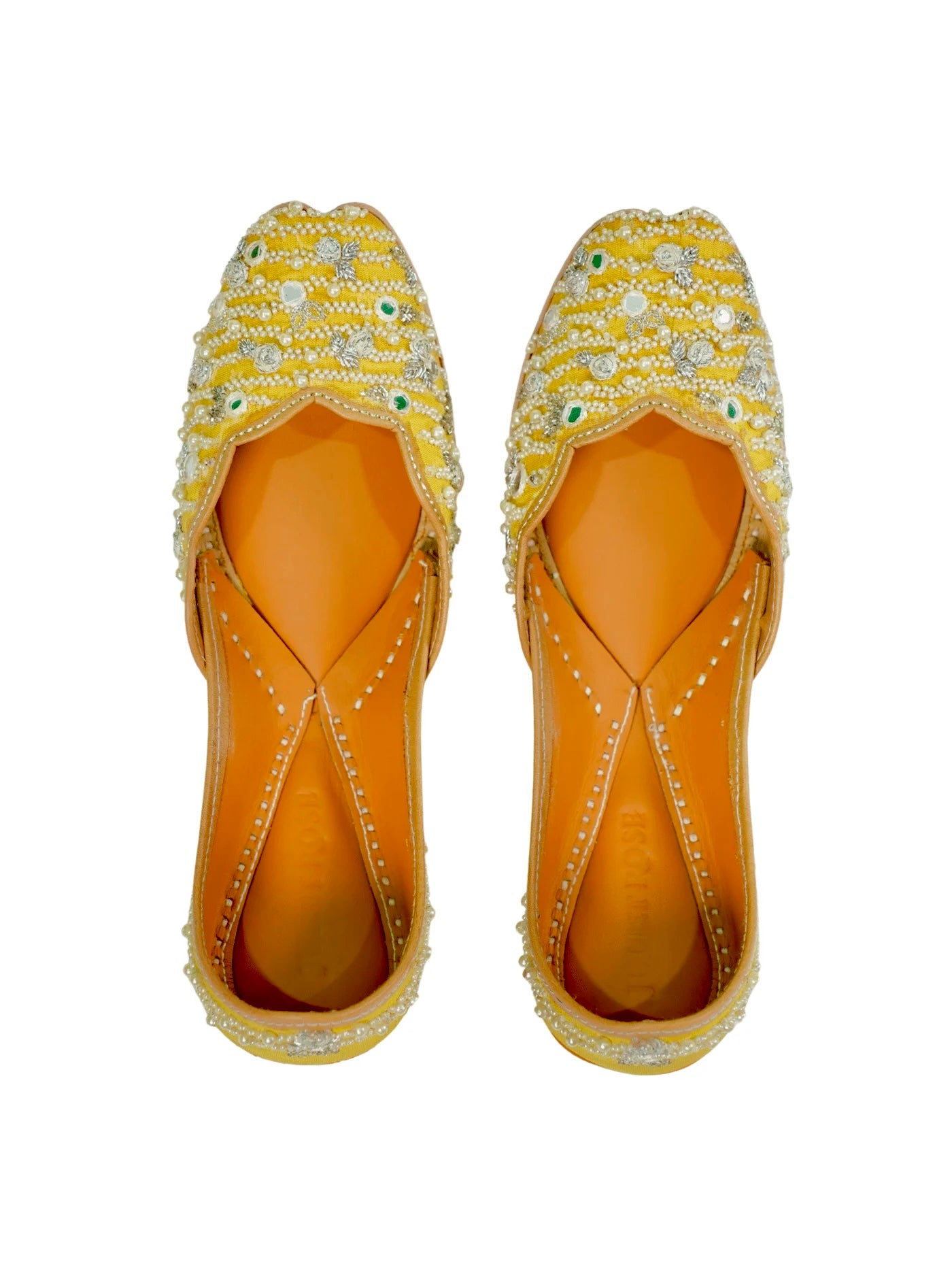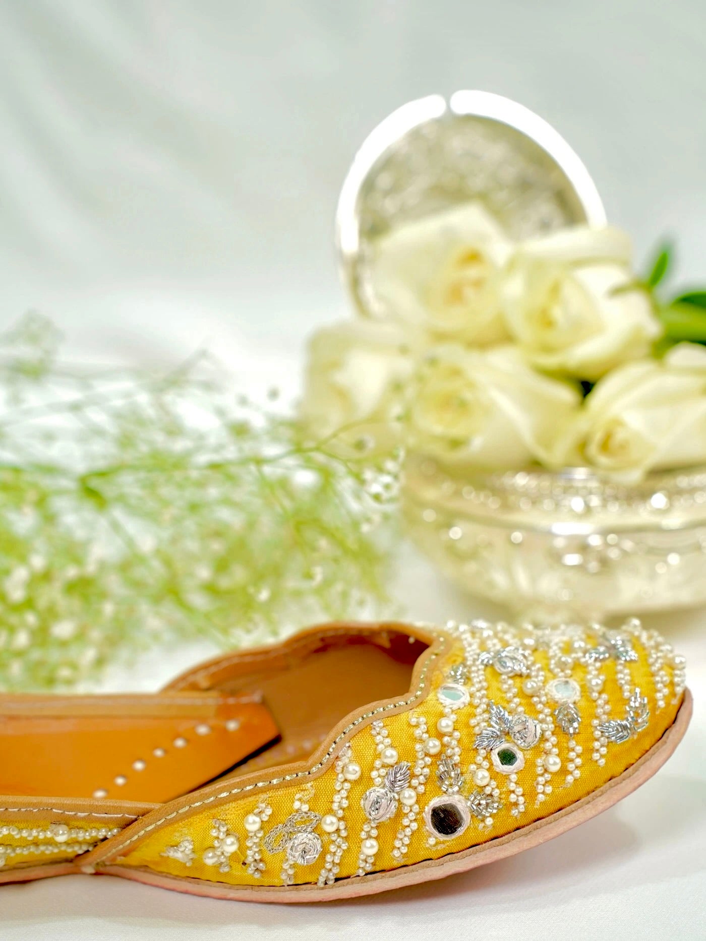Step into GULZAAR, where a sun-drenched marigold garden blooms with every step you take. This isn't just a jutti; it's a piece of wearable poetry, designed for moments of serene elegance and quiet celebration. She is the gentle morning light, the soft whisper of blooming flowers, captured in a silhouette of pure grace.