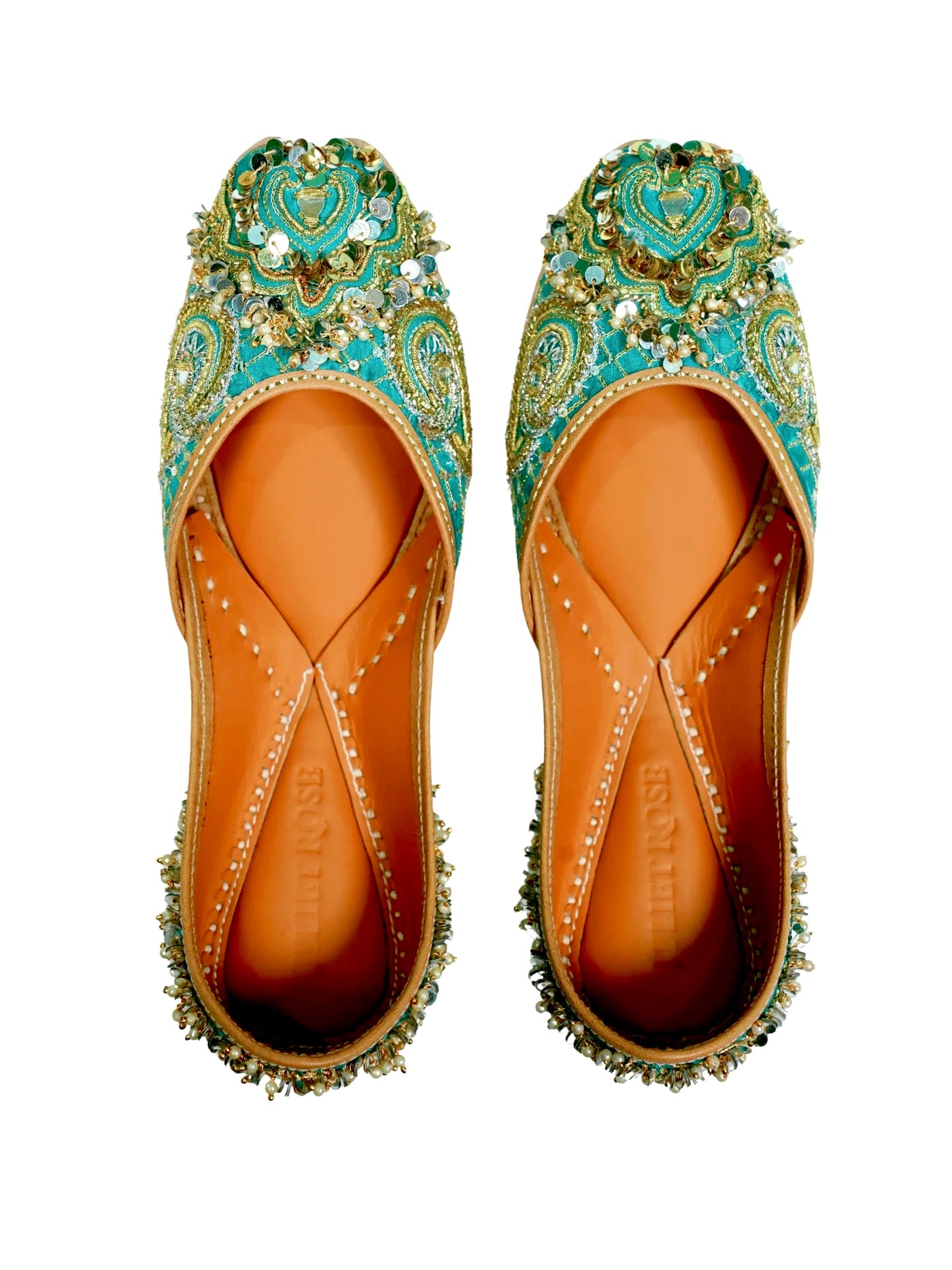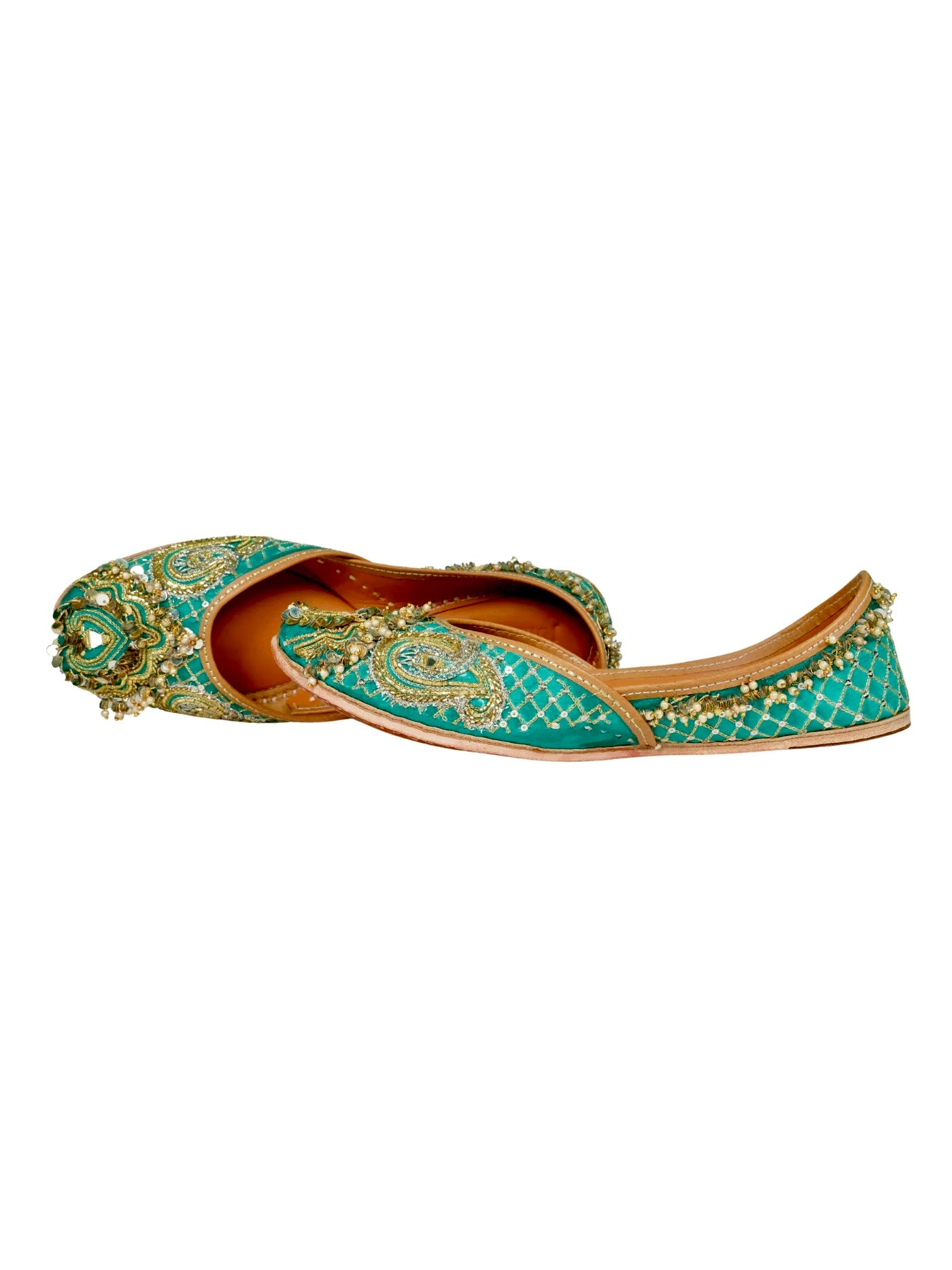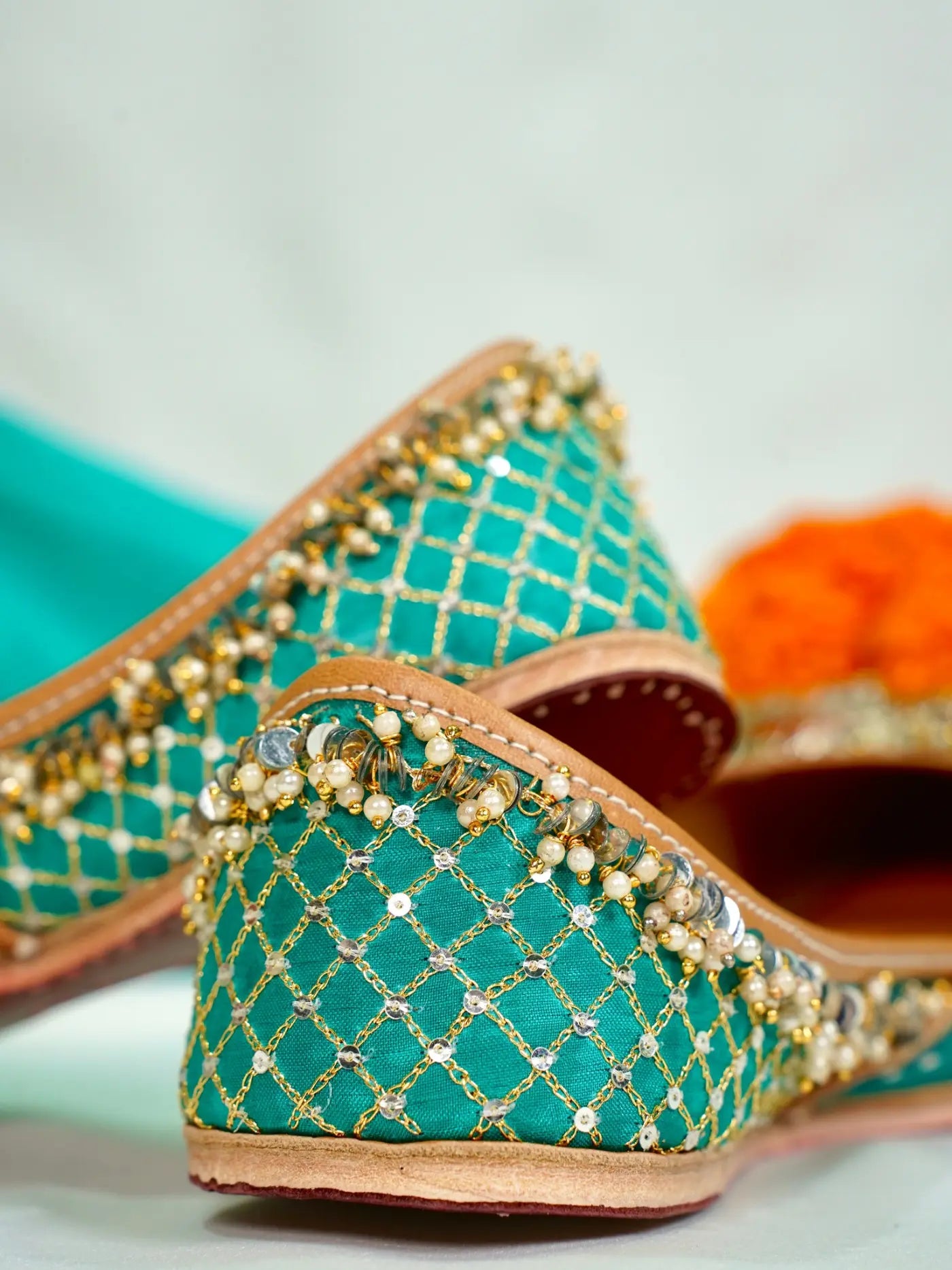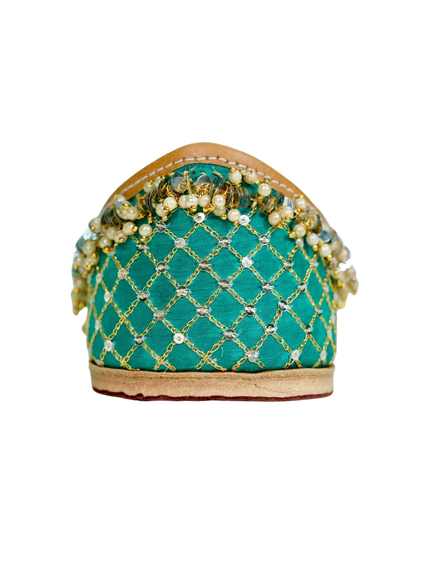 A dense, bubbly border of champagne beads and pearls frames the jutti, like foam settling gently on water, elevating her elegance and giving NILOFAR her ethereal charm.